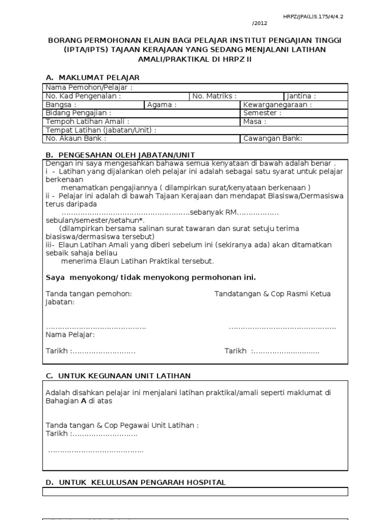 Surat Memohon Elaun Latihan Amali Bkns