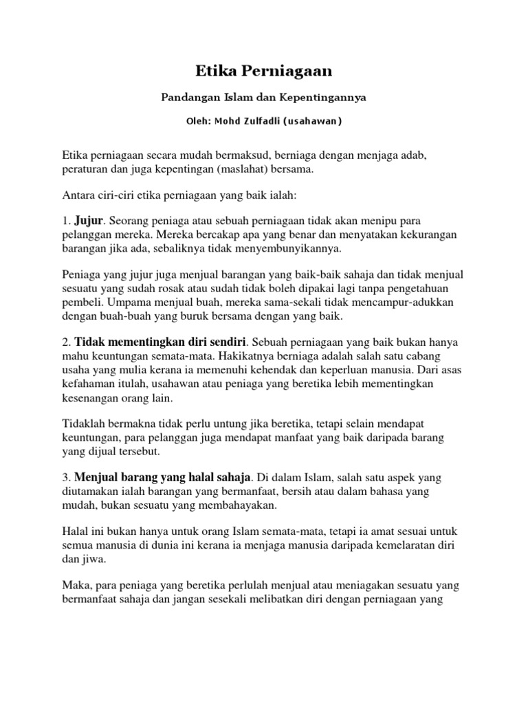 Etika perniagaan dalam islam pdf. Keadilan di samping itu menurut naqvi 1981 dalam buku muhammad nasri md. Perniagaan merupakan suatu amalan yang digalakkan dalam islam. Dalam pelaksanaannya islam menentukan pelbagai etika yang harus dipatuhi oleh peniaga.