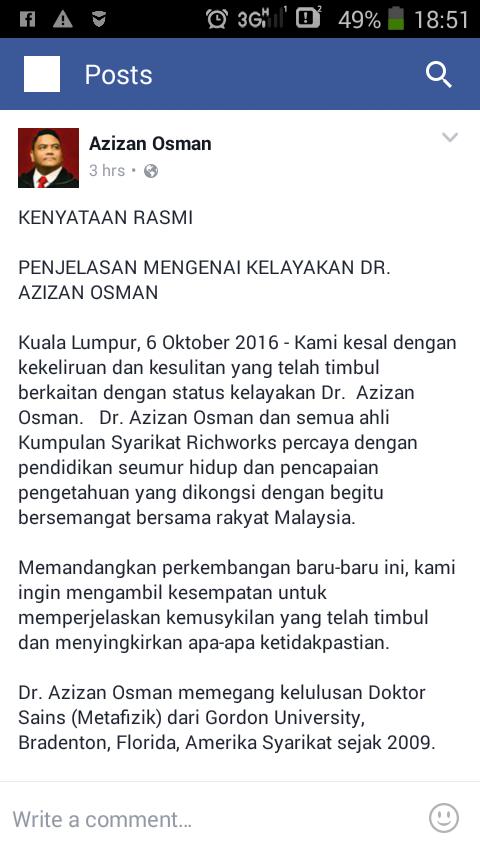 Kenyataan Rasmi Penipuan Status Phd Dr Azizan Osman